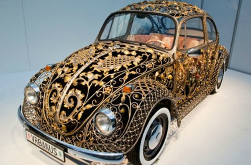 来自克罗地亚的一间铁艺工作室Vrbanus的三位艺术家,花费超过3500小时,手工打造出这辆1970款的大众甲壳虫汽车,外形复古优雅。Vrbanus擅长生产优雅的铁艺大门和围栏,这次打造这款甲壳虫汽车更是充分展示了他们的实力,铁艺设计精美,外围镶嵌金箔,内部饰以手工真皮,整辆车因此增重420千克。